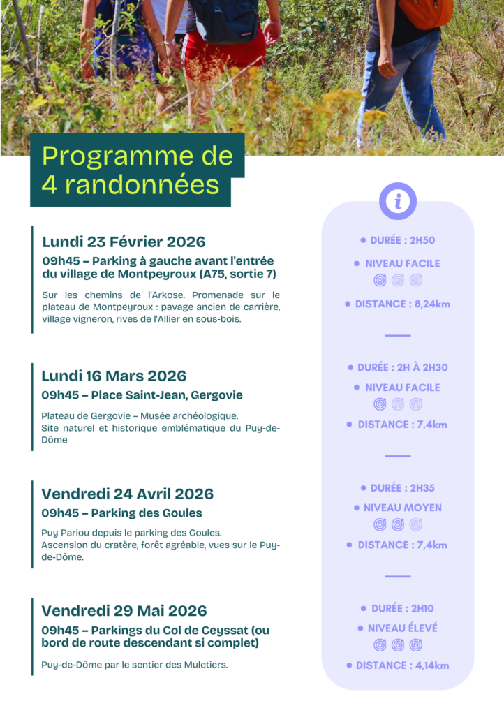 Dans le cadre de ses actions en faveur de l’inclusion par le sport et la nature, l’équipe du DAHLIR – Puy-de-Dôme, organise en cette année 2026, un programme de quatre randonnées accessibles à tous, avec une attention particulière portée aux personnes réfugiées vivant en CHRS (Centre d’hébergement et de réinsertion social) ou bénéficiant du programme AGIR.